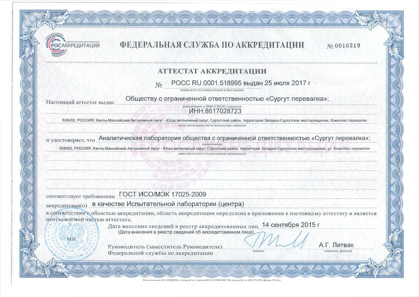 Аналитическая лаборатория аккредитована с 2012 года и ежегодно подтверждает компетентность и независимость